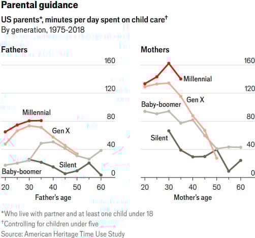 Millennial mothers in their 30s spend about 23% more time than Gen X mothers and 77% more than baby boomers.